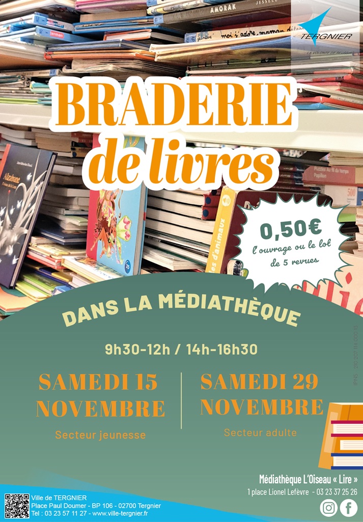Braderie de livres 0,50€ l'ouvrage ou le lot de 5 revues Catégorie Animation Détails des prochaines sessions Le samedi 15 novembre 2025 de 09:30 à 16:30 Ical Lieu Médiathèque de Tergnier Le samedi 29 novembre 2025 de 09:30 à 16:30 Ical Lieu Médiathèque de Tergnier Prochaines sessions