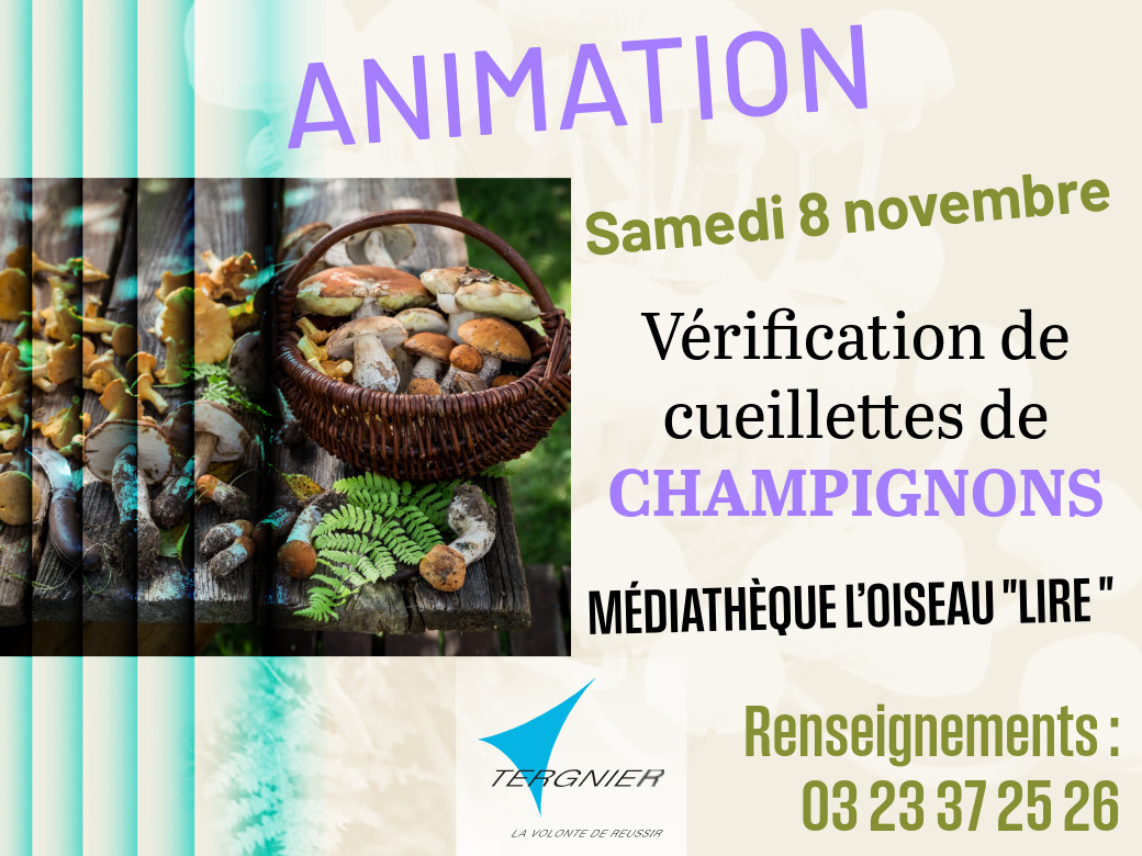 Vérification de cueillettes de champignons Animation gratuite Catégorie Animation Détails des prochaines sessions Le samedi 08 novembre 2025 Ical Lieu Médiathèque de Tergnier Prochaines sessions